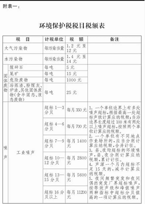 第六條 環(huán)境保護(hù)稅的稅目、稅額,依照本法所附《環(huán)境保護(hù)稅稅目稅額表》執(zhí)行。