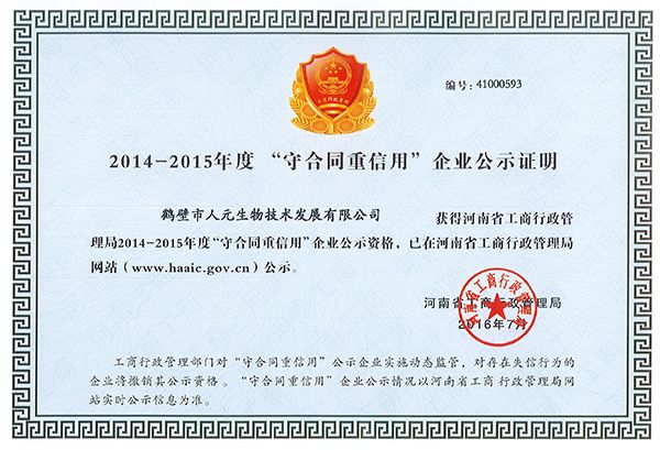 熱烈祝賀人元生物榮獲“重合同守信用企業(yè)”